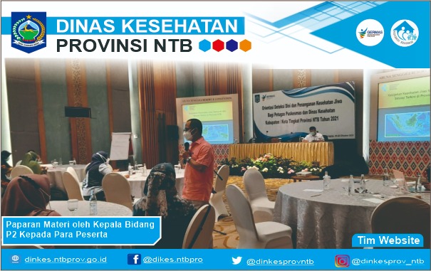 Untuk itu Dinas Kesehatan Provinsi NTB melalui Seksi P2PTM, Keswa dan Napza Bidang P2P menyelenggarakan Pelatihan Orientasi Deteksi Dini dan Peningkatan Kesehatan Jiwa Bagi Petugas Puskesmas dan Dinas Kesehatan Kabupaten/Kota Se- NTB selama 3 hari mulai tanggal 20 – 22 Oktober 2021 di Hotel Aruna Senggigi dan dibuka secara resmi oleh Kepala Dinas Kesehatan Provinsi NTB dr. H. Lalu Hamzi Fikri, MM, MARS.