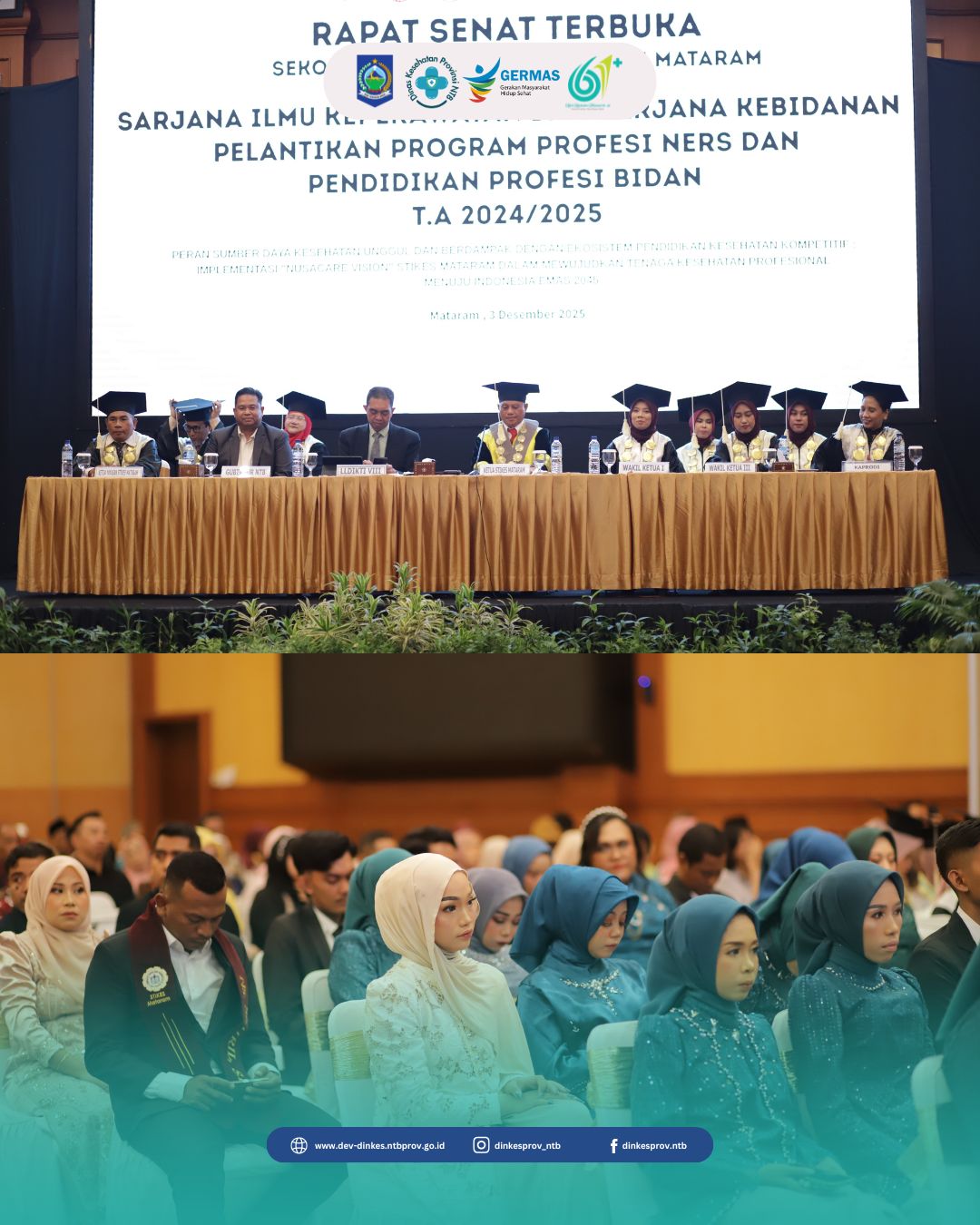 Sekolah Tinggi Ilmu Kesehatan (STIKES) Mataram menyelenggarakan Rapat Senat Terbuka dalam rangka Wisuda Sarjana Ilmu Keperawatan, Sarjana Kebidanan, serta Pelantikan Program Profesi Ners dan Pendidikan Profesi Bidan Tahun Ajaran 2024/2025. Kegiatan berlangsung khidmat di Hotel Lombok Raya Mataram pada Rabu (3/12). Kegiatan ini juga dihadiri civitas akademika, para wisudawan, keluarga, serta mitra dunia kesehatan.