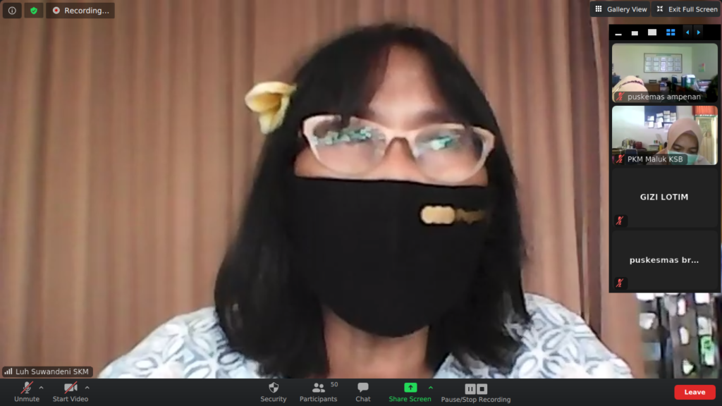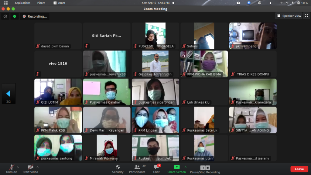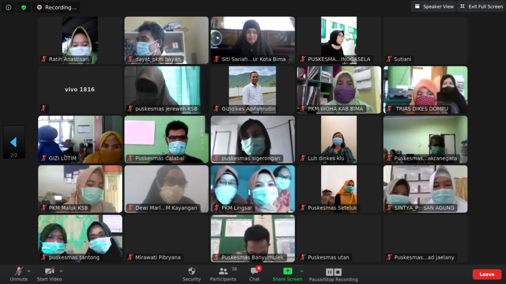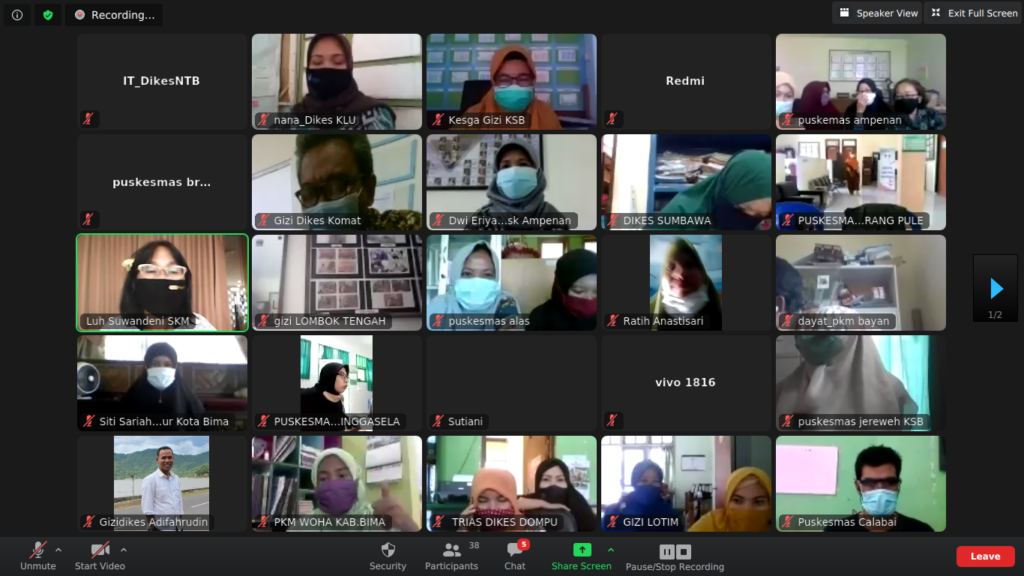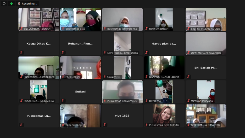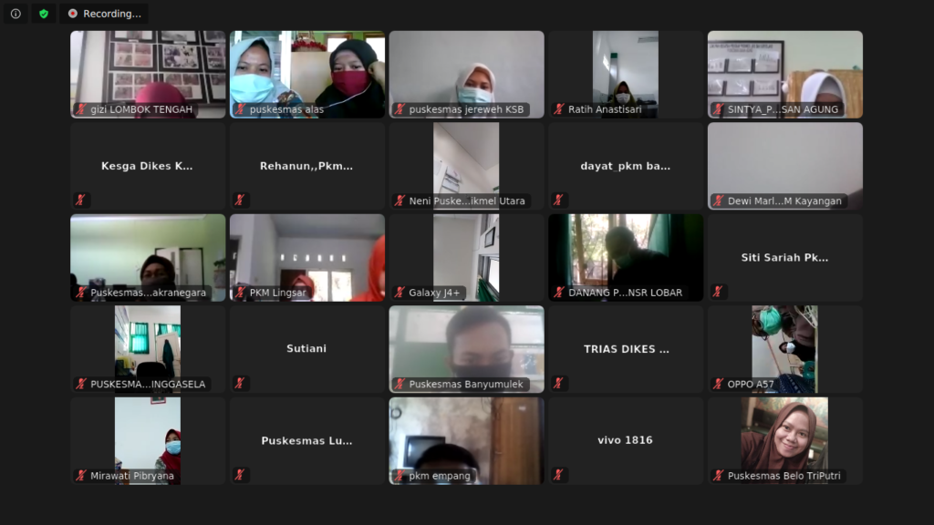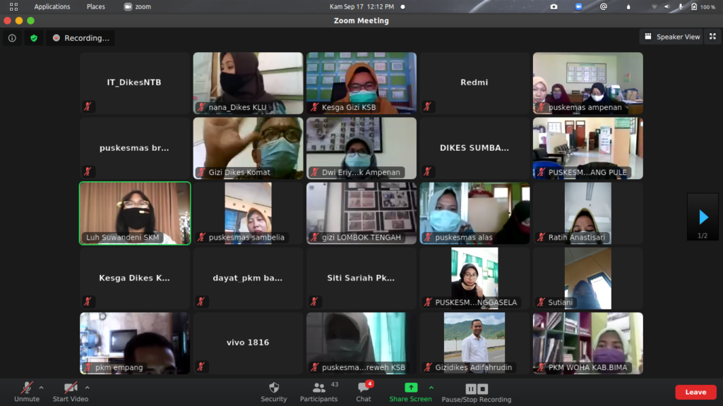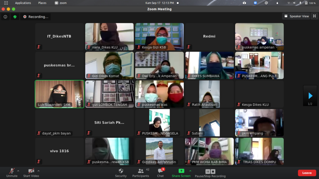 Hari ini (17/09/2020) bertempat di hotel lombok plaza mataram, seksi gizi masyarakat melaksanakn kegiatan EVALUASI PELAKSANAAN SURVEILANS GIZI MELALUI e-PPGBM secara daring. Peserta yang bergabung dalam rapat ini berasal dari Dinas kesehatan Provinsi NTB yakni Kepala Seksi Kesmas, Promkes, serta dari DInas Kesehatan di Kabupaten Kota dan Puskesmas di kabupaten kota dengan total jumlah yang bergabung kurang lebih 50 orang.