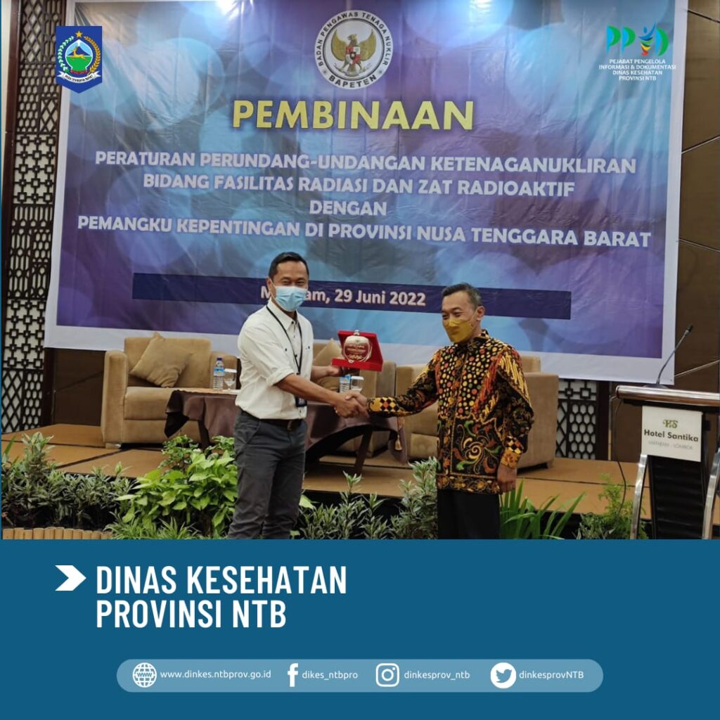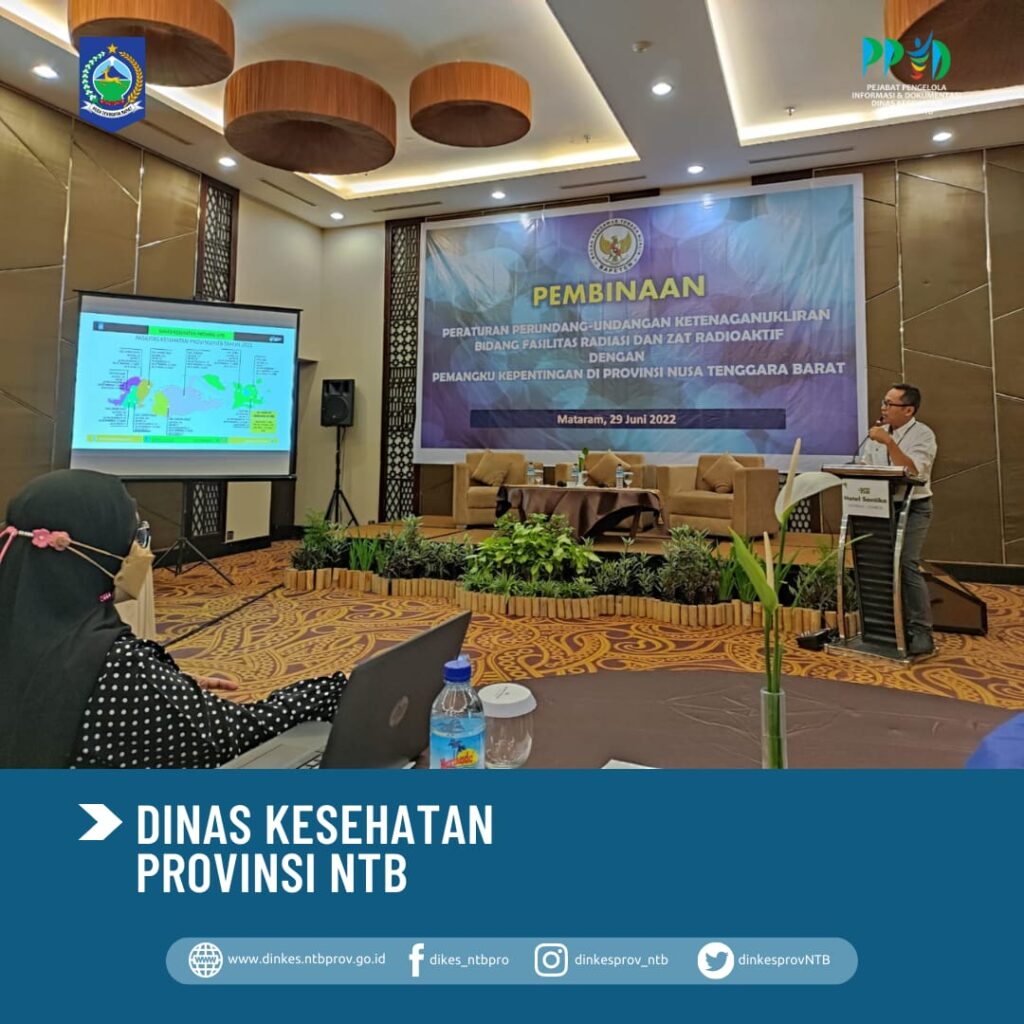 Sekretaris Dinas Kesehatan Provinsi NTB (dr. Handomi), mewakili Kepala Dinas Kesehatan Provinsi NTB (dr. H. Lalu Hamzi Fikri, MM.,MARS), menghadiri Pertemuan Pembinaan Peraturan Perundang-udangan Bidang Fasilitas Radiasi dan Zat Radioaktif dengan Pemangku Kepentingan di Provinsi Nusa Tenggara Barat, Rabu (29/06), di Hotel Santika Mataram.