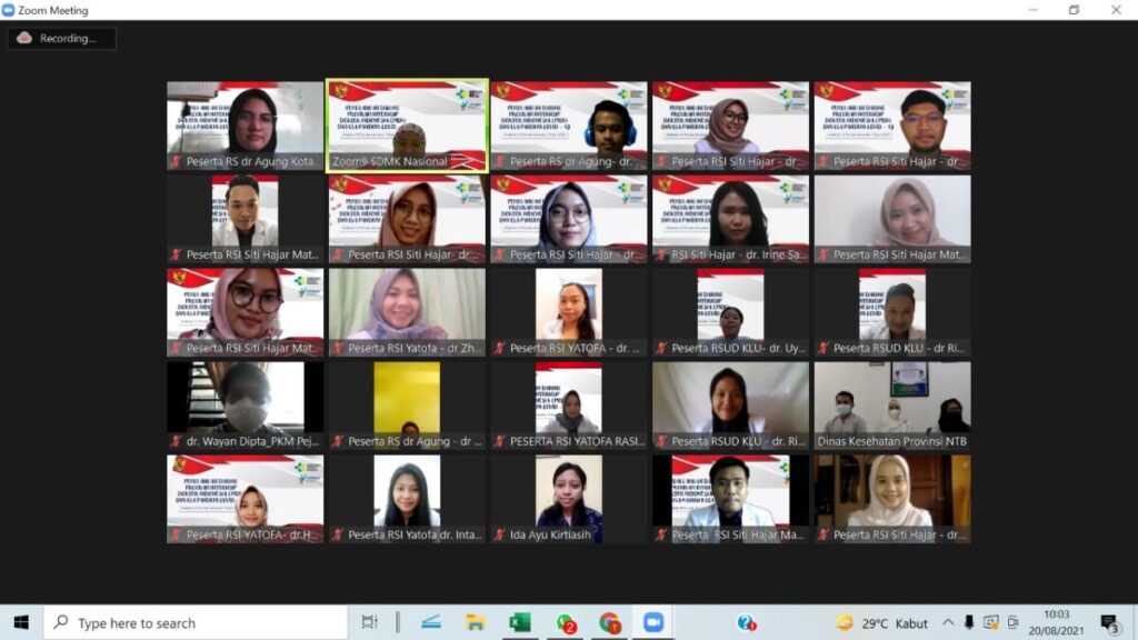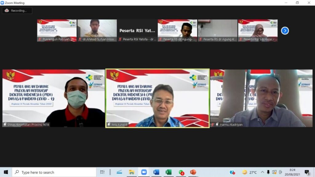 Mataram, Jumat (20/08/2021). Seksi PSDMK Bidang SDK Dinas Kesehatan Provinsi NTB menyelenggarakan Acara Pemulangan Peserta Program Internsip Dokter Indonesia (PIDI) Angkatan IV Periode November 2020 di Provinsi NTB secara virtual di Aula Prima Husada Dikes Provinsi NTB.