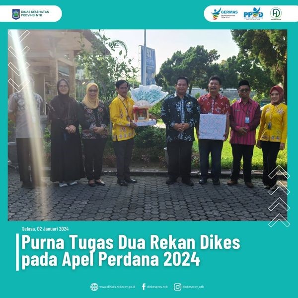Apel perdana Dinas Kesehatan Provinsi NTB dirangkaikan dengan pelepasan dua orang rekan yang purna tugas, yakni I Made Parnaya, S.Sos,MM (seksi PTM Bidang P2P) dan I Made Suartono, SKM (Bidang Yankes).